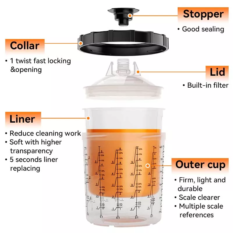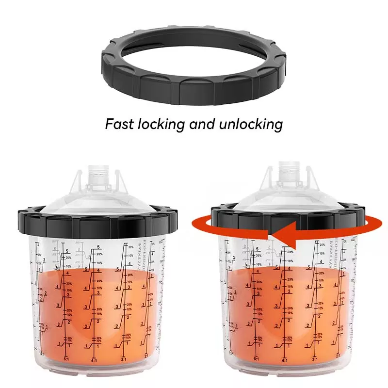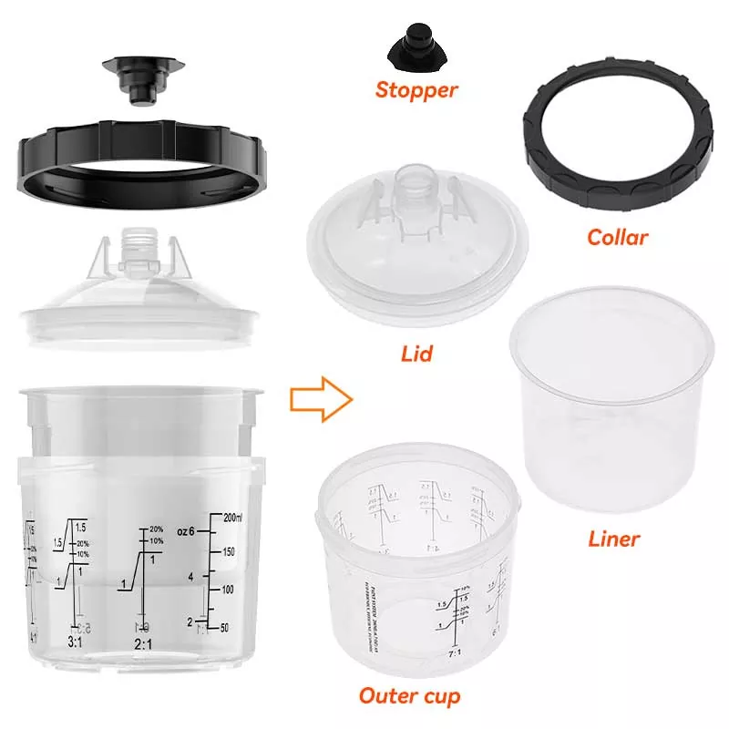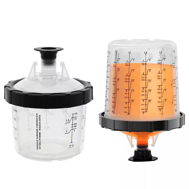 Ten jednorazowy pojemnik na farbę o pojemności 200 ml 1.0 zasadniczo zastępuje tradycyjny kubek zasilany grawitacyjnie, ponieważ nie tylko pozwala zaoszczędzić więcej farby, ale także poprawia wydajność malowania. W szczególności wykwintna konstrukcja automatycznego spiralnego opadania wykładziny podczas malowania umożliwia pełne wykorzystanie farby; Tymczasem konstrukcja szybkiego blokowania i wymiany wkładki pozwala uniknąć mycia kubka, umożliwiając wydajne i wielokrotne wykonywanie prac malarskich. Posiadamy adaptery do prawie wszystkich marek pistoletów natryskowych dostępnych na rynku, aby zaspokoić potrzeby różnych entuzjastów pistoletów natryskowych. Adapter wykonany jest ze stali nierdzewnej, która jest odporna na korozję lakieru i bardzo trwała. Szczelne połączenie wkładki z pokrywką sprawia, że z systemu kubków nie wycieka farba podczas malowania, a także ułatwia długotrwałe przechowywanie niewykorzystanej farby, aby uniknąć jej marnowania.