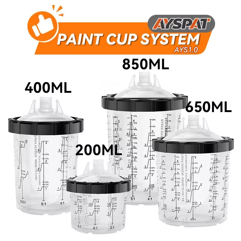 System jednorazowych kubków z rozpylaczem AYSPAT składa się z pięciu części: kubka zewnętrznego ze skalą, jednorazowej wkładki PE, pokrywki z filtrem, kołnierza łączącego kubek z pokrywką oraz korka z podstawą. System ten łączy w sobie wiele funkcji, takich jak mieszanie farb, filtrowanie, natryskiwanie, przechowywanie, upraszcza proces wstępnego przygotowania do malowania natryskowego i pozwala zaoszczędzić na kosztach zakupu oddzielnych lejków papierowych i kubków do mieszania farb.