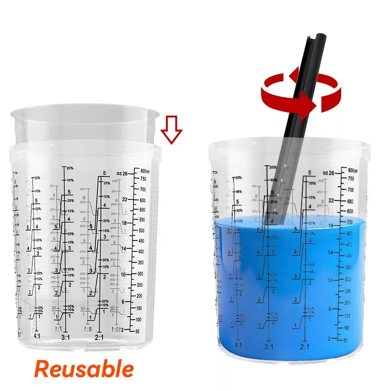 Zewnętrzny kubek wielokrotnego użytku ze skalą proporcji mieszania. Włóż jednorazową wyściółkę do zewnętrznego kubka i wymieszaj farbę bezpośrednio w wyściółce. Zmniejsz koszty materiałów, nie używając tradycyjnego kubka do mieszania.