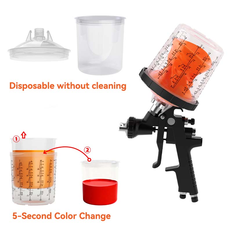 Thejednorazowy kubek na pistolet natryskowy nie wymaga czyszczenia po użyciu; po prostu wyrzuć wewnętrzny kubek, aby szybko zmienić kolor, skracając odstęp między zmianami koloru z 20 minut do 5 sekund, skutecznie podwajając dzienną produkcję. Pokrywka posiada wbudowany filtr dokładny, który skutecznie filtruje zanieczyszczenia, zapewniając równomierny i gładki strumień, co skutkuje wyższą jakością wykończenia.
